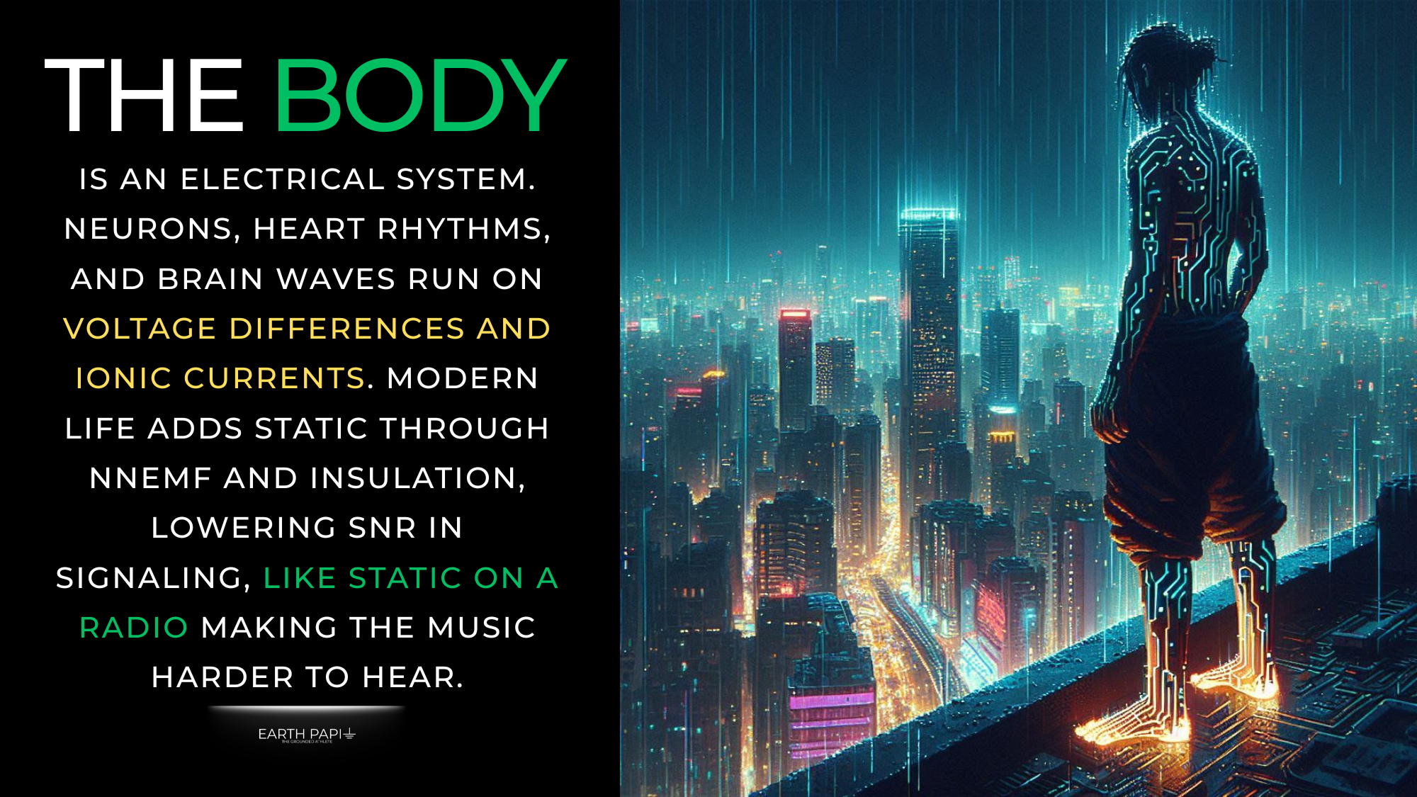 The human body is fundamentally an electrical system. Nerve impulses, cardiac rhythms, and brain oscillations all rely on voltage differences and ionic currents. But in a modern environment filled with non-native electromagnetic fields (nnEMF) and insulated living, the body can accumulate static charges and electrical noise. This noise lowers SNR in bioelectrical signaling, much like static on a radio makes a song harder to hear.