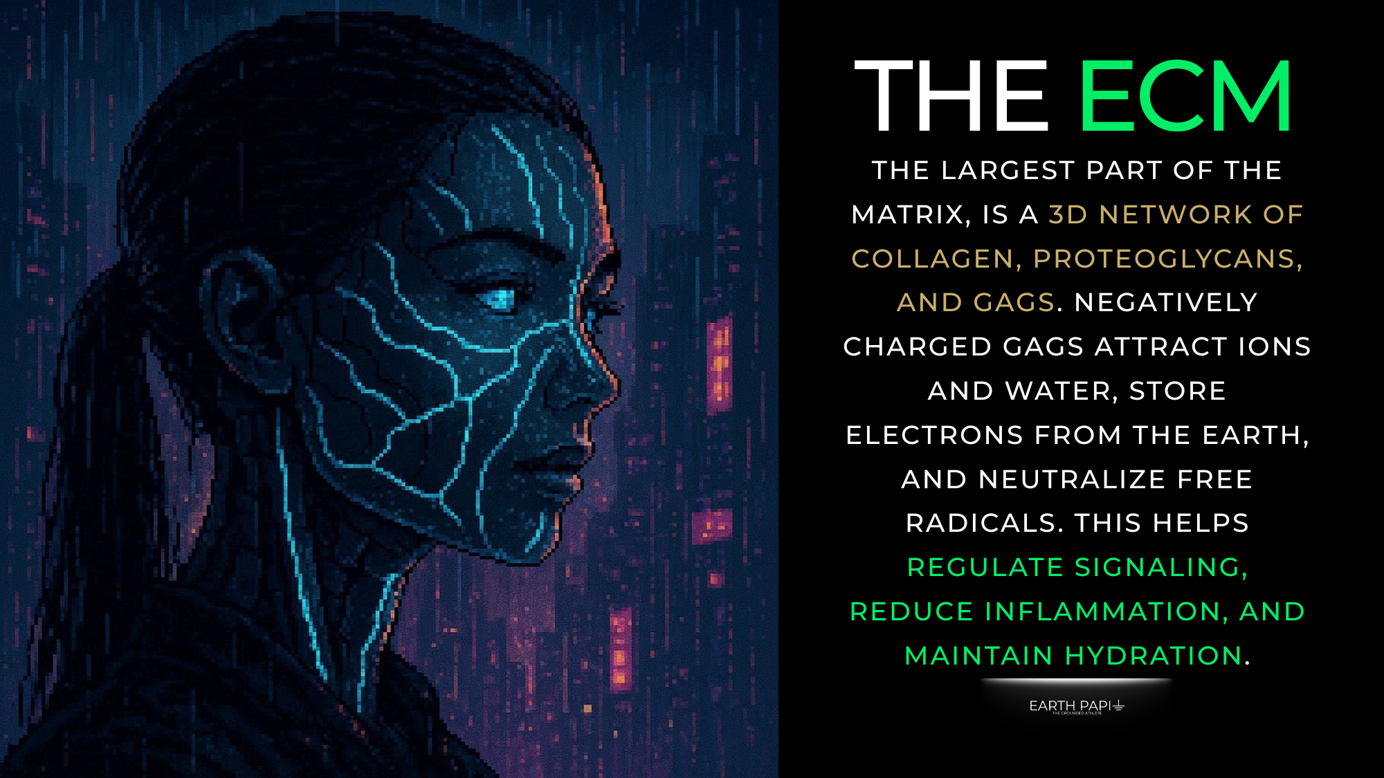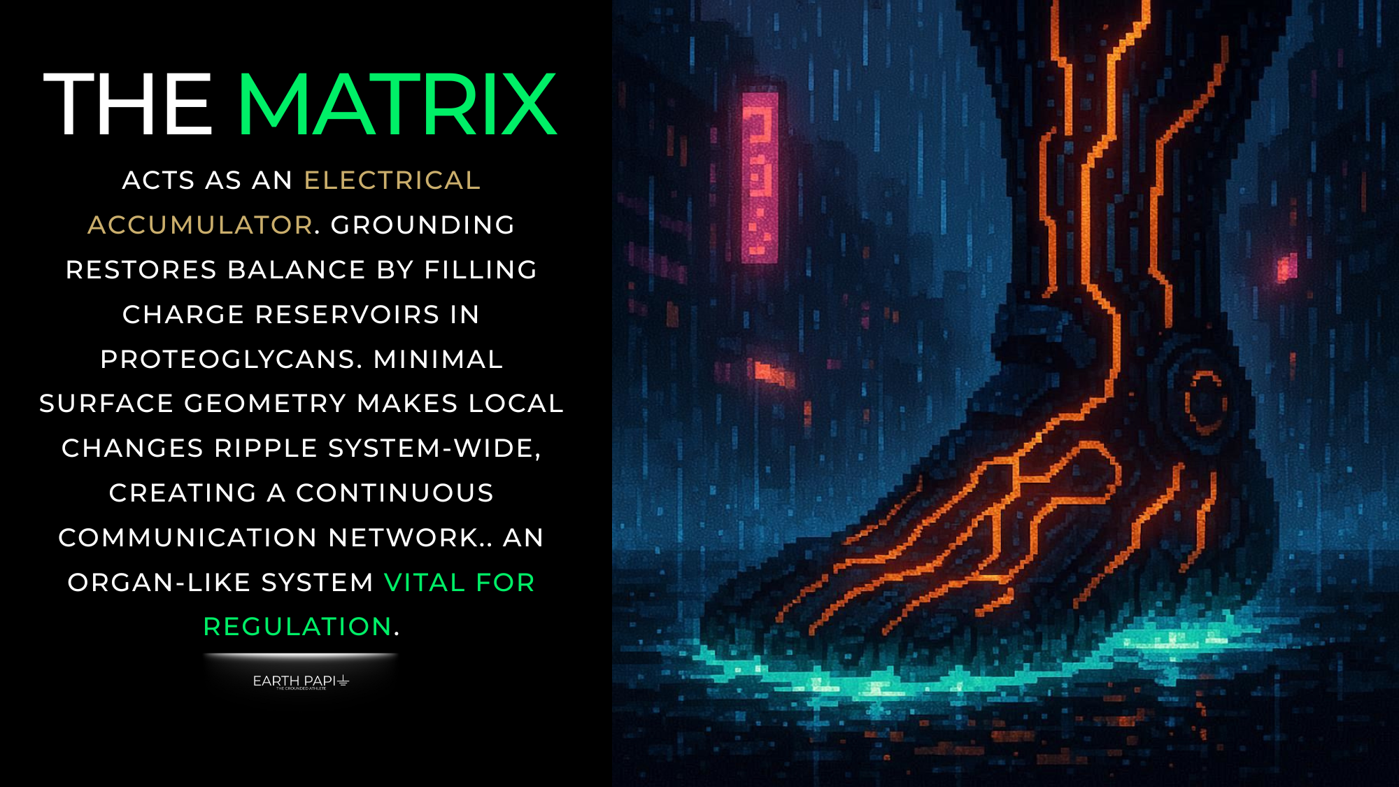 In essence, the matrix functions as a biophysical accumulator for electrical charge. Direct contact with the Earth restores electrical balance within the proteoglycan network and its extensions into cells and nuclei, leading to measurable physiological shifts.